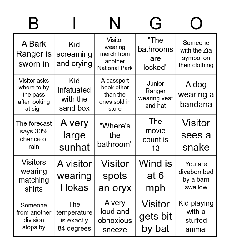 This bingo card has a free space and 24 words: A visitor wearing Hokas, The temperature is exactly 84 degrees, A passport book other than the ones sold in store, Someone from another division stops by, Someone with the Zia symbol on their clothing, A Bark Ranger is sworn in, Visitor asks where to by the pass after looking at sign, Kid screaming and crying, The movie count is 13, Visitor spots an oryx, Junior Ranger wearing vest and hat, The forecast says 30% chance of rain, Wind is at 6 mph, You are divebombed by a barn swallow, Kid infatuated with the sand box, Visitor gets bit by bat, Visitor sees a snake, Visitor wearing merch from another National Park, A dog wearing a bandana, A very large sunhat, Kid playing with a stuffed animal, Visitors wearing matching shirts, "The bathrooms are locked" and A very loud and obnoxious sneeze.