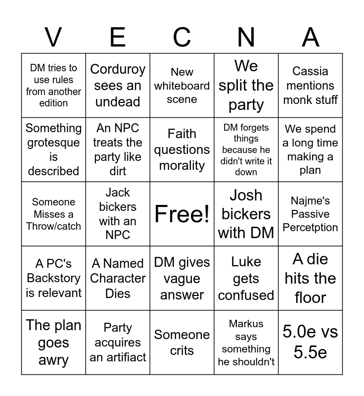This bingo card has a free space and 48 words: Rules Discussion, 5.0e vs 5.5e, Najme is a Construct, Someone crits, A Named Character Dies, DM Loading Screen, Corduroy sees an undead, A previous campaign is referenced, Something grotesque is described, There are secrets, An NPC treats the party like dirt, We split the party, A die hits the floor, Luke gets confused, Lotr is mentioned, Lizzie does math wrong, Faith questions morality, Josh bickers with DM, Chris sneezes, Cassia mentions monk stuff, Jack bickers with an NPC, Markus says something he shouldn't, DM tries to use rules from another edition, DM forgets things because he didn't write it down, Shopping Session, We spend a long time making a plan, The plan goes awry, A dragon appears, DM gives vague answer, A PC's Backstory is relevant, A PC keeps a secret from the party, DM roleplays with himself, Someone gets inspiration, A character is missing a hand/eye, Party acquires an artifiact, Social encounter becomes a combat encounter, Significant off-topic conversation, Najme's Passive Percetption, Corduroy wanders off alone, Faith makes art, New sculpted mini, New lego scene, New whiteboard scene, Luke adds something other than character death to the death count, Someone Misses a Throw/catch, Something is retconned, The DM checks if something is in or out of character and PCs have important conversation accidentally in front of NPCs.