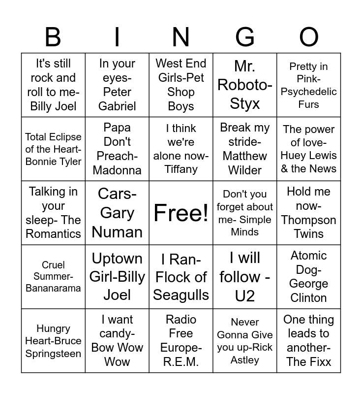 This bingo card has a free space and 25 words: Uptown Girl-Billy Joel, Radio Free Europe-R.E.M., I think we're alone now-Tiffany, Hungry Heart-Bruce Springsteen, Pretty in Pink-Psychedelic Furs, It's still rock and roll to me- Billy Joel, Total Eclipse of the Heart- Bonnie Tyler, In your eyes-Peter Gabriel, Don't you forget about me- Simple Minds, I Ran- Flock of Seagulls, Break my stride-Matthew Wilder, Talking in your sleep- The Romantics, I will follow - U2, Atomic Dog-George Clinton, Papa Don't Preach-Madonna, Sunglasses at night- Corey Hart, Hold me now- Thompson Twins, West End Girls-Pet Shop Boys, The power of love- Huey Lewis & the News, Cars-Gary Numan, One thing leads to another- The Fixx, I want candy-Bow Wow Wow, Cruel Summer-Bananarama, Mr. Roboto- Styx and Never Gonna Give you up-Rick Astley.