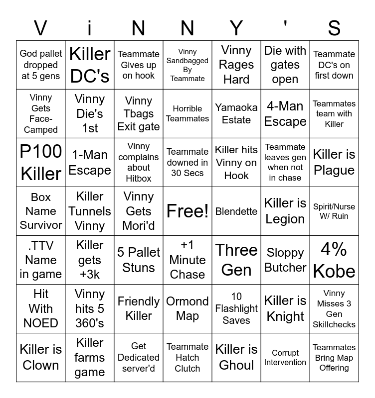 This bingo card has a free space and 48 words: .TTV Name in game, Killer Tunnels Vinny, Get Dedicated server'd, +1 Minute Chase, Yamaoka Estate, Killer is Legion, Teammate DC's on first down, Killer is Clown, 1-Man Escape, Vinny Gets Mori'd, Vinny Sandbagged By Teammate, Vinny Rages Hard, Teammate leaves gen when not in chase, Killer is Plague, Box Name Survivor, Vinny hits 5 360's, Teammate Gives up on hook, Teammate downed in 30 Secs, 10 Flashlight Saves, Die with gates open, Teammates team with Killer, Vinny Gets Face-Camped, Killer DC's, Vinny Tbags Exit gate, Killer is Ghoul, 4-Man Escape, Spirit/Nurse W/ Ruin, Hit With NOED, Killer gets +3k, Vinny complains about Hitbox, Ormond Map, Killer hits Vinny on Hook, Killer is Knight, Vinny Misses 3 Gen Skillchecks, God pallet dropped at 5 gens, Killer farms game, 5 Pallet Stuns, Teammate Hatch Clutch, Blendette, Corrupt Intervention, 4% Kobe, P100 Killer, Vinny Die's 1st, Friendly Killer, Horrible Teammates, Three Gen, Sloppy Butcher and Teammates Bring Map Offering.
