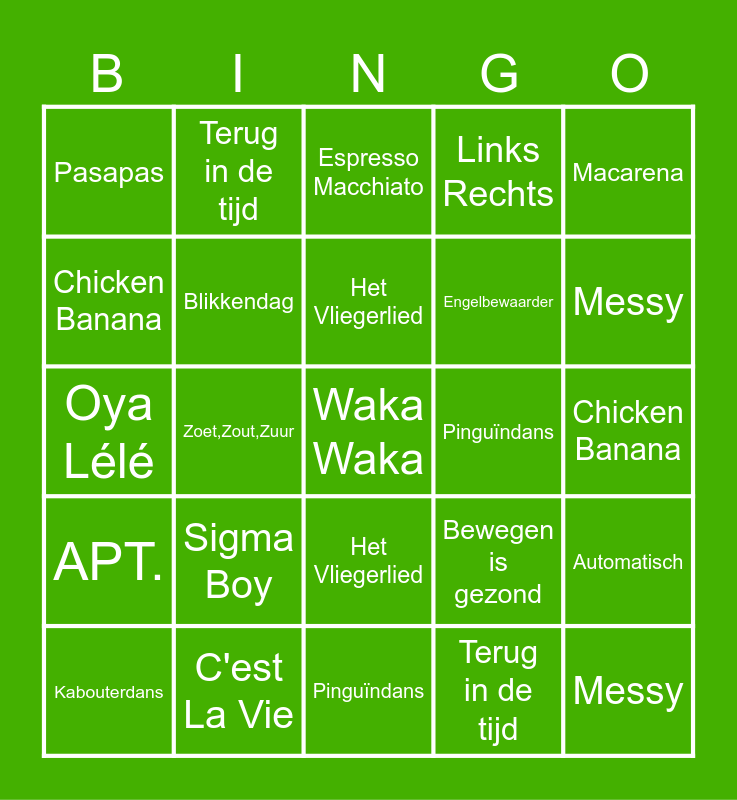 ⚠ This card has duplicate items: Baila Bailalaa (2), C'est La Vie (2), Huisfeestje (2), APT. (2), Terug in de tijd (2), Blikkendag (2), Zoet,Zout,Zuur (2), Engelbewaarder (2), Oya Lélé (2), Links Rechts (2), Sigma Boy (2), Chicken Banana (2), Europapa (2), Bewegen is gezond (2), Pasapas (2), Waka Waka (2), Macarena (2), De Vloer Is Lava (2), Het Vliegerlied (2), Pinguïndans (2), Espresso Macchiato (2), Kabouterdans (2), Automatisch (2), Lose Control (2), Ladada (2), Shake it to the max (2), Ordinary (2), Messy (2), Pedro (2)
