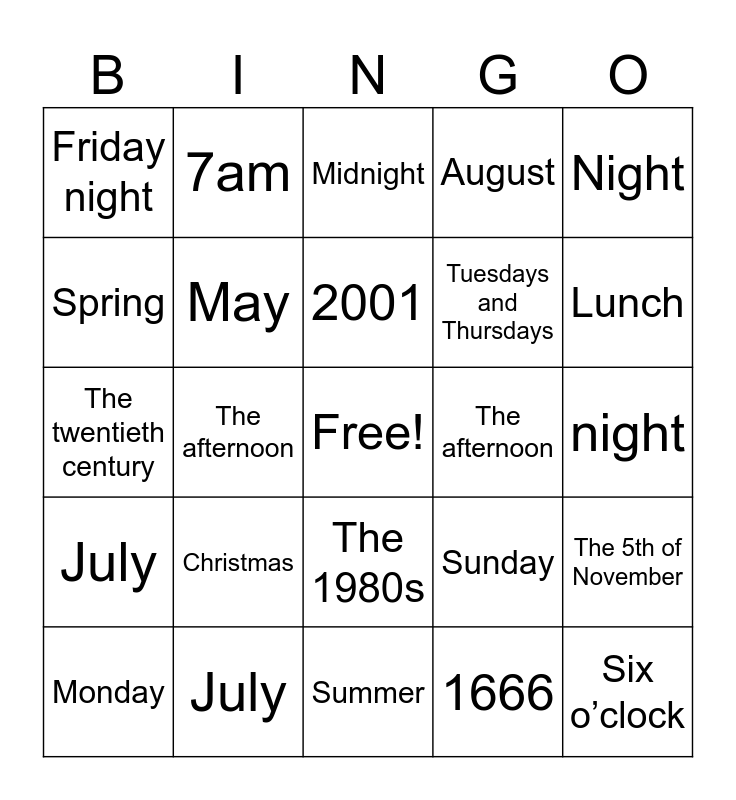 This bingo card has a free space and 24 words: Christmas, July, 2001, Monday, Night, Friday night, Spring, 7am, The afternoon, The 1980s, Tuesdays and Thursdays, The twentieth century, Sunday, The 5th of November, May, 1666, night, Midnight, Lunch, The afternoon, Six o’clock, July, August and Summer.