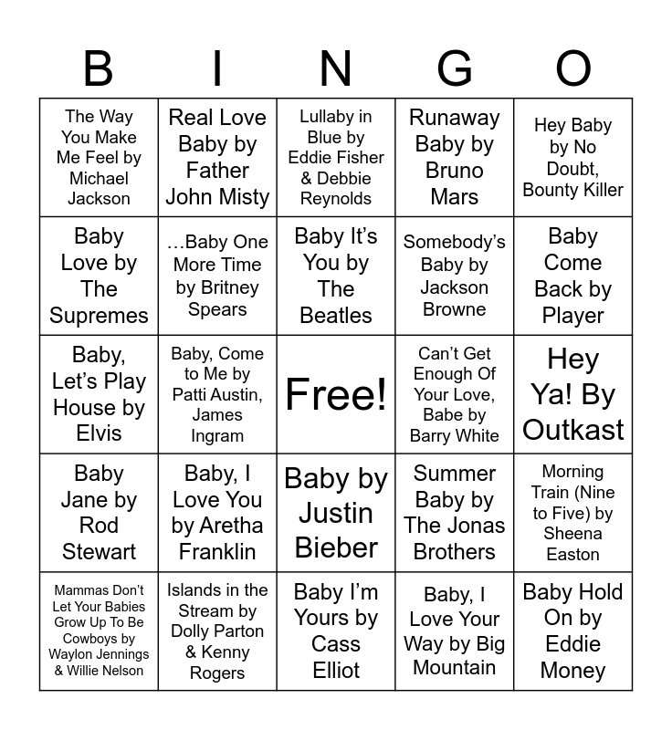 This bingo card has a free space and 35 words: Be My Baby by The Ronettes, Always Be My Baby by Mariah Carey, Ice Ice Baby by Vanilla Ice, …Baby One More Time by Britney Spears, Baby by Justin Bieber, Runaway Baby by Bruno Mars, Baby Love by The Supremes, I’m Your Baby Tonight by Whitney Houston, Baby It’s You by The Beatles, One For My Baby by Frank Sinatra, Baby, Let’s Play House by Elvis, Hey Baby by No Doubt, Bounty Killer, Come On Over Baby (All I Want Is You) by Christina Aguilera, Haven’t Met You Yet by Michael Bible, The Way You Make Me Feel by Michael Jackson, Can’t Get Enough Of Your Love, Babe by Barry White, Baby, I Love Your Way by Big Mountain, Baby, Come to Me by Patti Austin, James Ingram, Baby Jane by Rod Stewart, Baby Hold On by Eddie Money, Summer Baby by The Jonas Brothers, Mammas Don’t Let Your Babies Grow Up To Be Cowboys by Waylon Jennings & Willie Nelson, Morning Train (Nine to Five) by Sheena Easton, Islands in the Stream by Dolly Parton & Kenny Rogers, Lullaby in Blue by Eddie Fisher & Debbie Reynolds, Baby Come Back by Player, I Got You Babe by Sonny & Cher, Cry Baby by Janis Joplin, Somebody’s Baby by Jackson Browne, Hey Ya! By Outkast, Pretty Little Baby by Connie Francis, Baby I’m Yours by Cass Elliot, Baby, I Love You by Aretha Franklin, Real Love Baby by Father John Misty and How Sweet It Is (To Be Loved By You) by Marvin Gaye.