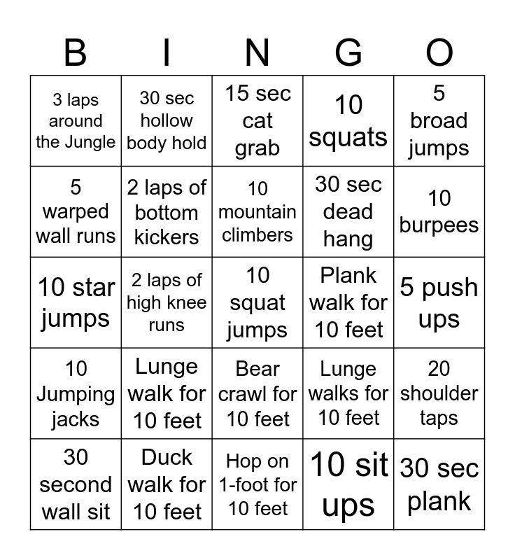 This bingo card has a free space and 24 words: Lunge walk for 10 feet, Duck walk for 10 feet, 10 mountain climbers, 30 second wall sit, 5 broad jumps, 3 laps around the Jungle, 5 warped wall runs, 30 sec hollow body hold, Plank walk for 10 feet, Bear crawl for 10 feet, 30 sec dead hang, 10 star jumps, Lunge walks for 10 feet, 20 shoulder taps, 2 laps of bottom kickers, 10 sit ups, 5 push ups, 15 sec cat grab, 10 burpees, 2 laps of high knee runs, 30 sec plank, 10 Jumping jacks, 10 squats and Hop on 1-foot for 10 feet.