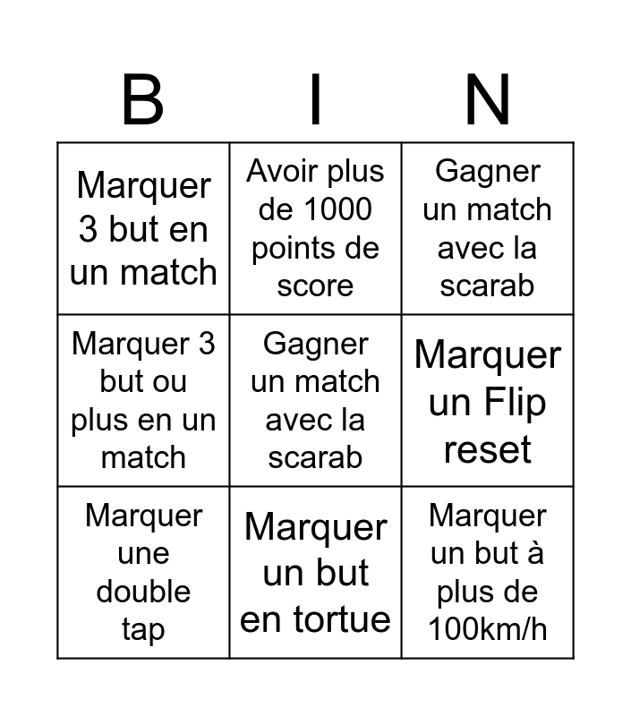 This bingo card has 14 words: Marquer avec une fake, Marquer avec un pintch, Marquer une double tap, Avoir plus de 1000 points de score, Marquer 3 but ou plus en un match, Gagner un match avec la scarab, Marquer un but à plus de 100km/h, Détruire l'autre, Marquer un but en tortue, Marquer 3 but en un match, Marquer un pintch, Marquer un Flip reset, Gagner un match avec la scarab and Fai.