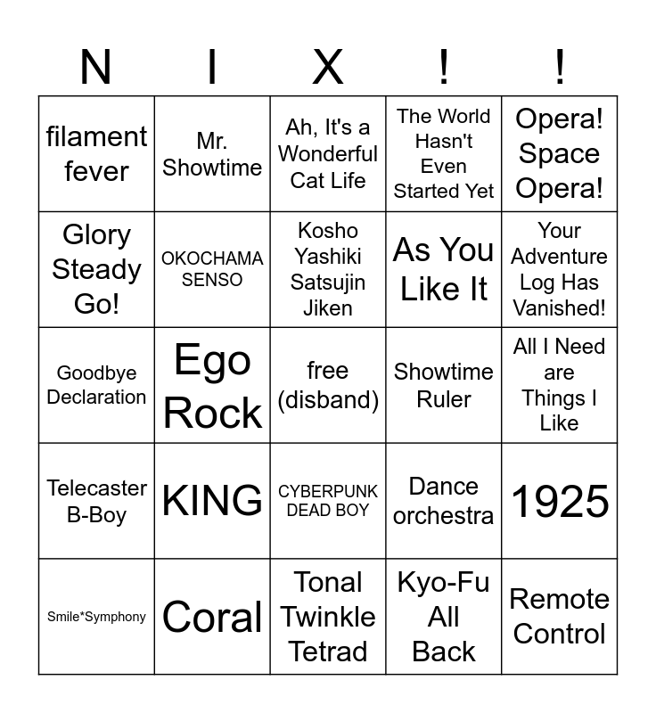 This bingo card has a free space and 24 words: KING, Coral, Kosho Yashiki Satsujin Jiken, Smile*Symphony, Opera! Space Opera!, filament fever, Glory Steady Go!, Mr. Showtime, Showtime Ruler, CYBERPUNK DEAD BOY, As You Like It, Goodbye Declaration, Dance orchestra, 1925, OKOCHAMA SENSO, Kyo-Fu All Back, All I Need are Things I Like, Ah, It's a Wonderful Cat Life, Your Adventure Log Has Vanished!, Ego Rock, Remote Control, Telecaster B-Boy, The World Hasn't Even Started Yet and Tonal Twinkle Tetrad.
