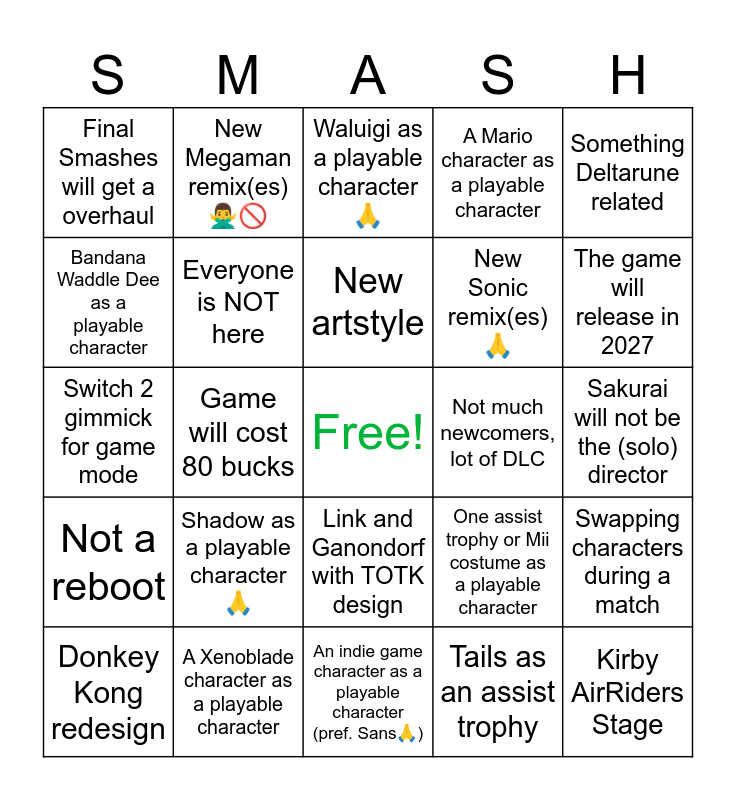This bingo card has a free space and 24 words: Shadow as a playable character π, A Xenoblade character as a playable character, New artstyle, Donkey Kong redesign, Something Deltarune related, Final Smashes will get a overhaul, Bandana Waddle Dee as a playable character, New Megaman remix(es) π ββοΈπ«, Not much newcomers, lot of DLC, Link and Ganondorf with TOTK design, New Sonic remix(es) π, Switch 2 gimmick for game mode, One assist trophy or Mii costume as a playable character, Swapping characters during a match, Everyone is NOT here, Tails as an assist trophy, Sakurai will not be the (solo) director, Waluigi as a playable character π, The game will release in 2027, Game will cost 80 bucks, Kirby AirRiders Stage, Not a reboot, A Mario character as a playable character and An indie game character as a playable character (pref. Sansπ).