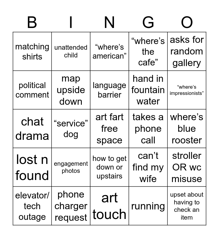This bingo card has a free space and 50 words: dead fish boomer face, upset about having to check an item, help rejection, art touch, engagement photos, MAGA hat, unattended child, bathroom is gross, political comment, surprised i work here full time, map upside down, “where’s the cafe”, stroller OR wc misuse, can’t find my wife, goes the wrong way after getting directions, after 5pm cc pickup, language barrier, takes a phone call, family with 4+ kids, asks for random gallery, “service” dog, running, matching shirts, hand in fountain water, “where’s da vinci”, “where’s vg portrait”, “where’s impressionists”, “where’s bathroom”, “where’s american”, how to get down or upstairs, cool purse/ outfit, president portraits, how to get to concourse, trash on floor, phone charger request, drink/eat in gallery, public family argument, walks away mid help, touch plants to see if real, where’s blue rooster, volunteer drama, blocking stairs, door, elevator, middle schoolers are loud, littles, elevator/ tech outage, chat drama, 10k+ steps, “where’s special exhibition”, lost n found and loud and wrong.