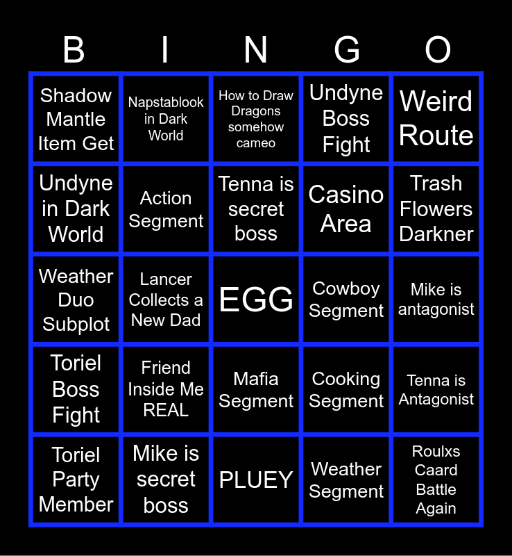 This bingo card has a free space and 24 words: Friend Inside Me REAL, Mike is secret boss, Tenna is secret boss, Toriel Party Member, Weird Route, Shadow Mantle Item Get, Undyne in Dark World, Napstablook in Dark World, Cowboy Segment, Mafia Segment, Casino Area, Weather Duo Subplot, Cooking Segment, Tenna is Antagonist, Action Segment, Weather Segment, Mike is antagonist, How to Draw Dragons somehow cameo, Trash Flowers Darkner, Lancer Collects a New Dad, Roulxs Caard Battle Again, Toriel Boss Fight, Undyne Boss Fight and PLUEY.