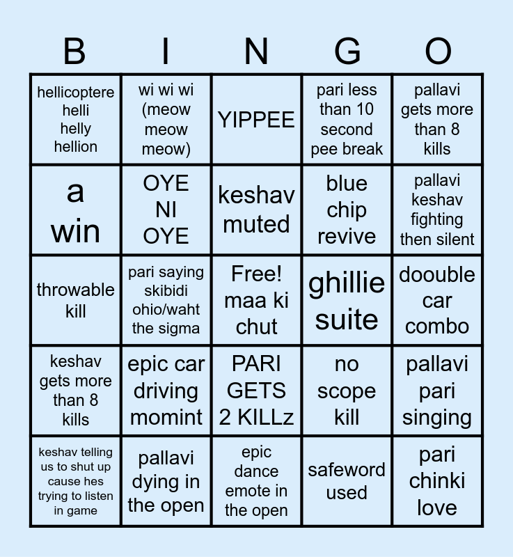 This bingo card has a free space and 29 words: keshav telling us to shut up cause hes trying to listen in game, pallavi saying "For me?~", pari saying skibidi ohio/waht the sigma, dying before getting a gun, hellicoptere helli helly hellion, YIPPEE, OYE NI OYE, epic car driving momint, ghillie suite, pallavi dying in the open, doouble car combo, pari chinki love, epic dance emote in the open, safeword used, pallavi keshav fighting then silent, sult shaming, PARI GETS 2 KILLz, keshav gets more than 8 kills, pallavi gets more than 8 kills, throwable kill, no scope kill, pari not moving to be saved, blue chip revive, a win, pari less than 10 second pee break, wi wi wi (meow meow meow), pallavi pari singing, keshav muted and pallavi being nonchalant in dire sitaution.
