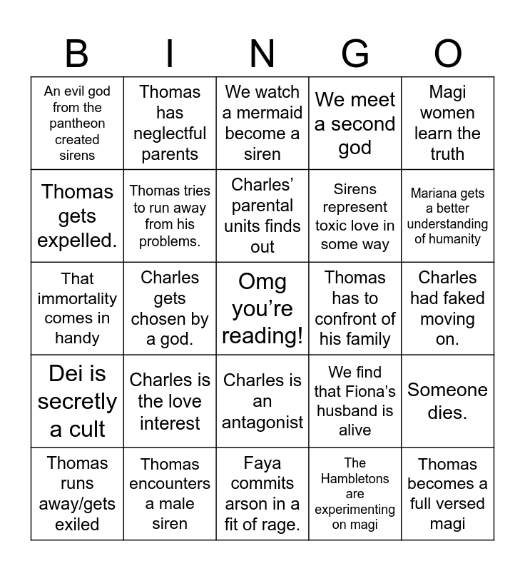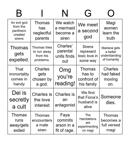 This bingo card has a free space and 24 words: Charles is the love interest, Thomas encounters a male siren, Charles’ parental units finds out, Thomas runs away/gets exiled, Magi women learn the truth, An evil god from the pantheon created sirens, Thomas gets expelled., Thomas has neglectful parents, Thomas has to confront of his family, Charles is an antagonist, Sirens represent toxic love in some way, That immortality comes in handy, We find that Fiona’s husband is alive, Someone dies., Thomas tries to run away from his problems., The Hambletons are experimenting on magi, Charles had faked moving on., We watch a mermaid become a siren, Mariana gets a better understanding of humanity, Charles gets chosen by a god., Thomas becomes a full versed magi, Dei is secretly a cult, We meet a second god and Faya commits arson in a fit of rage..