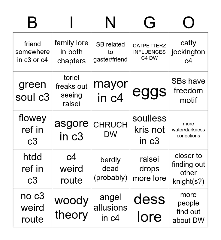 This bingo card has a free space and 24 words: c4 weird route, woody theory, mayor in c4, no c3 weird route, catty jockington c4, friend somewhere in c3 or c4, green soul c3, family lore in both chapters, soulless kris not in c3, berdly dead (probably), eggs, flowey ref in c3, ralsei drops more lore, closer to finding out other knight(s?), toriel freaks out seeing ralsei, dess lore, more water/darkness conections, SB related to gaster/friend, SBs have freedom motif, asgore in c3, more people find out about DW, htdd ref in c3, CATPETTERZ INFLUENCES C4 DW and angel allusions in c4.