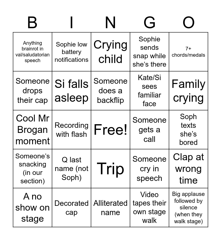 This bingo card has a free space and 25 words: Q last name (not Soph), Alliterated name, Someone does a backflip, A no show on stage, 7+ chords/medals, Anything brainrot in val/saludatorian speech, Someone drops their cap, Sophie low battery notifications, Someone gets a call, Trip, Kate/Si sees familiar face, Cool Mr Brogan moment, Someone cry in speech, Clap at wrong time, Si falls asleep, 3+ distinct shoe colors, Soph texts she’s bored, Crying child, Family crying, Recording with flash, Big applause followed by silence (when they walk stage), Decorated cap, Someone’s snacking (in our section), Sophie sends snap while she’s there and Video tapes their own stage walk.