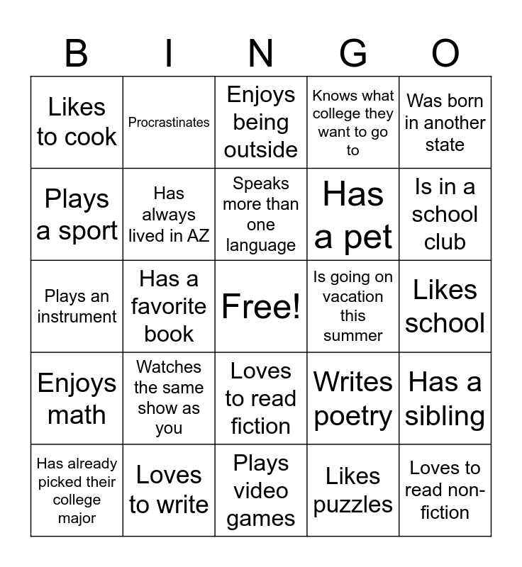 This bingo card has a free space and 24 words: Watches the same show as you, Loves to write, Speaks more than one language, Has already picked their college major, Was born in another state, Likes to cook, Plays a sport, Procrastinates, Is going on vacation this summer, Loves to read fiction, Has a pet, Plays an instrument, Writes poetry, Has a sibling, Has always lived in AZ, Likes puzzles, Likes school, Enjoys being outside, Is in a school club, Has a favorite book, Loves to read non-fiction, Enjoys math, Knows what college they want to go to and Plays video games.