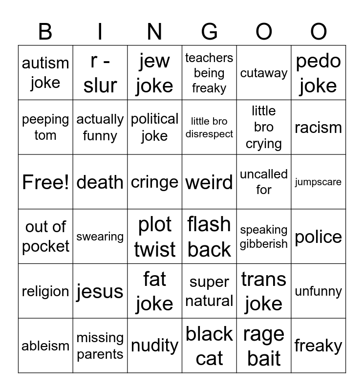 This bingo card has 36 words: super natural, fat joke, black cat, peeping tom, out of pocket, weird, actually funny, nudity, cutaway, trans joke, racism, teachers being freaky, unfunny, death, little bro disrespect, autism joke, religion, uncalled for, Free!, jew joke, cringe, swearing, flash back, plot twist, speaking gibberish, r -slur, little bro crying, missing parents, political joke, pedo joke, freaky, ableism, police, jumpscare, jesus and rage bait.