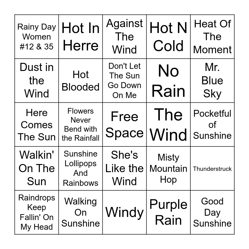This bingo card has a free space and 75 words: A Hard Rain's A-Gonna Fall, After the Storm, Against The Wind, Ain't No Sunshine, Aquarius/Let The Sunshine In, Blame It on the Rain, Blowin' in the Wind, Candle In The Wind, Cold as Ice, Cold Heart, Cold Hearted, Cyclone, Don't Let The Sun Go Down On Me, Dust in the Wind, Fire and Rain, Flowers Never Bend with the Rainfall, Fool in the Rain, Good Day Sunshine, Have You Ever Seen The Rain, Heat Of The Moment, Heatwave, Here Comes The Sun, Hot Blooded, Hot In Herre, Hot N Cold, House Of The Rising Sun, Hurricane, I Love a Rainy Night, Ice Ice Baby, I'll Follow The Sun, Island In The Sun, It's A Sunshine Day, It's Raining Men, Misty Mountain Hop, Mr. Blue Sky, No Rain, Only Happy When It Rains, Over the Rainbow, Pocketful of Sunshine, Purple Rain, Rain, Rain Is A Good Thing, Rain King, Rain On Me, Rain Over Me, Rainbow Connection, Raindrops Keep Fallin' On My Head, Rainy Day Women #12 & 35, Rock You Like A Hurricane, Set Fire to the Rain, Shelter from the Storm, She's Like the Wind, Singin' in the Rain, Snow On The Beach, Steal My Sunshine, Summer Wind, Sundown, Sunny Afternoon, Sunshine, Sunshine (Go Away Today), Sunshine Lollipops And Rainbows, Sunshine Of Your Love, Sunshine On My Shoulders, The Thunder Rolls, The Tide Is High, The Wind, The Wind Cries Mary, Thunder, Thunder Road, Thunderstruck, Walkin' On The Sun, Walking On Sunshine, Who'll Stop The Rain, Windy and You Are The Sunshine Of My Life.