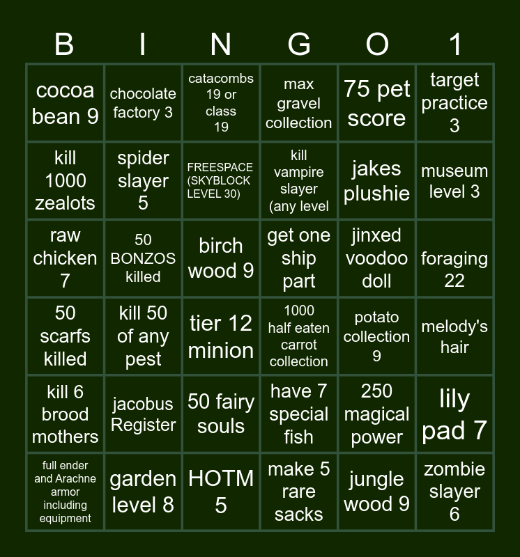 This bingo card has 36 words: 50 scarfs killed, kill 50 of any pest, HOTM 5, kill vampire slayer (any level, jinxed voodoo doll, foraging 22, cocoa bean 9, garden level 8, catacombs 19 or class 19, have 7 special fish, jakes plushie, target practice 3, kill 6 brood mothers, 50 BONZOS killed, FREESPACE (SKYBLOCK LEVEL 30), max gravel collection, 250 magical power, melody's hair, kill 1000 zealots, spider slayer 5, tier 12 minion, 1000 half eaten carrot collection, potato collection 9, lily pad 7, raw chicken 7, chocolate factory 3, birch wood 9, make 5 rare sacks, 75 pet score, museum level 3, full ender and Arachne armor including equipment, jacobus Register, 50 fairy souls, get one ship part, jungle wood 9 and zombie slayer 6.