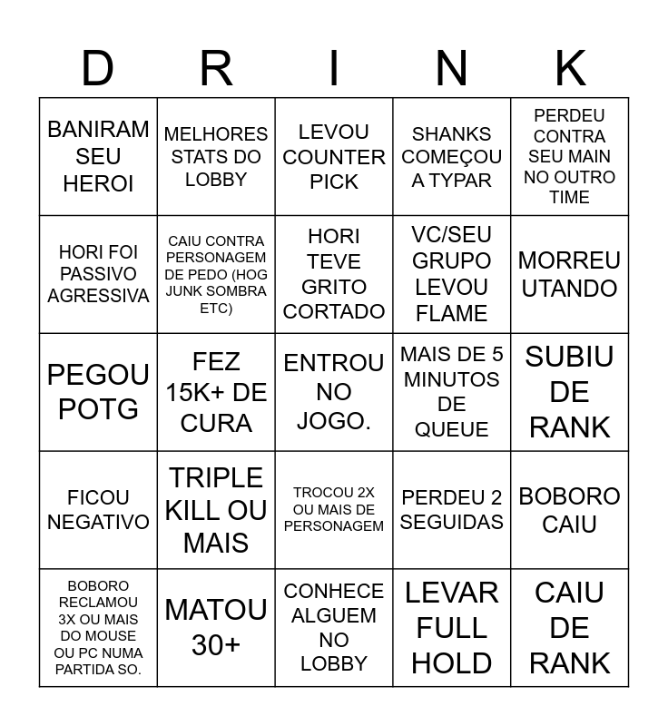 This bingo card has a free space and 30 words: MATOU 30+, FEZ 15K+ DE DANO, FEZ 15K+ DE CURA, MORREU 10X POR 10 MINUTOS OU MAIS, BANIRAM SEU HEROI, LEVOU COUNTER PICK, CAIU CONTRA PERSONAGEM DE PEDO (HOG JUNK SOMBRA ETC), TROCOU 2X OU MAIS DE PERSONAGEM, MAIS DE 5 MINUTOS DE QUEUE, CONHECE ALGUEM NO LOBBY, SUBIU DE RANK, CAIU DE RANK, LEVAR FULL HOLD, OTP MOIRA OU MERCY NO TIME, MORREU UTANDO, C9 EM QUALQUER UM DOS LADOS, PERDEU 2 SEGUIDAS, FICOU NEGATIVO, TRIPLE KILL OU MAIS, PERDEU CONTRA SEU MAIN NO OUTRO TIME, PEGOU POTG, CAIU COM ALGUEM QUE VOCE JA DEU AVOID, MELHORES STATS DO LOBBY, VC/SEU GRUPO LEVOU FLAME, HORI FOI PASSIVO AGRESSIVA, SHANKS COMEÇOU A TYPAR, BOBORO CAIU, BOBORO RECLAMOU 3X OU MAIS DO MOUSE OU PC NUMA PARTIDA SO., HORI TEVE GRITO CORTADO and SHANKS FEZ NADA DE DPS.