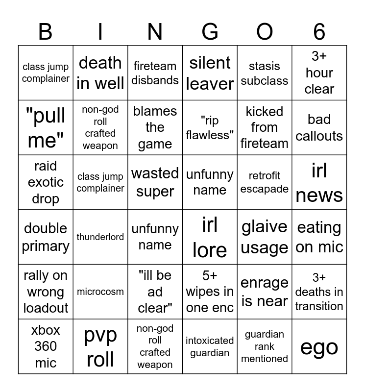 This bingo card has 36 words: 5+ wipes in one enc, "ill be ad clear", intoxicated guardian, "pull me", double primary, unfunny name, non-god roll crafted weapon, non-god roll crafted weapon, stasis subclass, enrage is near, bad callouts, silent leaver, 3+ deaths in transition, class jump complainer, "rip flawless", class jump complainer, rally on wrong loadout, retrofit escapade, raid exotic drop, fireteam disbands, wasted super, thunderlord, irl lore, unfunny name, glaive usage, death in well, kicked from fireteam, pvp roll, blames the game, 3+ hour clear, ego, xbox 360 mic, eating on mic, irl news, microcosm and guardian rank mentioned.