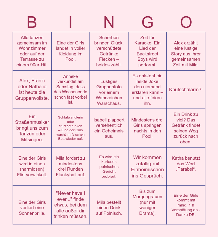 This bingo card has 25 words: Mila fordert zu mindestens drei Runden Flunkyball auf., Mila bestellt einen Drink auf Polnisch., Lustiges Gruppenfoto vor einem Wahrzeichen Warschaus., Eine der Girls verliert eine Sonnenbrille., Alex erzählt eine lustige Story aus ihrer gemeinsamen Zeit mit Mila., Alle tanzen gemeinsam im Wohnzimmer oder auf der Terrasse zu einem 90er-Hit., Alex, Franzi oder Nathalie ist heute die Gruppenvollste., Eine der Girls landet in voller Kleidung im Pool., Mindestens drei Girls springen nachts in den Pool., Es wird ein kurioses polnisches Gericht probiert., Es entsteht ein Inside Joke, den niemand erklären kann – und alle feiern ihn., Ein Straßenmusiker bringt uns zum Tanzen oder Mitsingen., Wir kommen zufällig mit Einheimischen ins Gespräch., Katha benutzt das Wort „Parabel“., Anneke verkündet am Samstag, dass das Wochenende schon fast vorbei ist., Eine der Girls kommt mit mind. 1 h Verspätung an - Danke DB., Ein Drink zu viel? Das Getränk findet seinen Weg zurück nach oben., Scherben bringen Glück, verschüttete Getränke Flecken – beides zählt., Knutschalarm?!, Schlafwandlerin oder sturzbetrunken – Eine der Girls wacht im falschen Bett wieder auf., Isabell plappert versehentlich ein Geheimnis aus., "Never have I ever..." finde etwas, bei dem alle außer dir trinken müssen., Eine der Girls wird in einen (harmlosen) Flirt verwickelt., Zeit für Karaoke: Ein Lied der Backstreet Boys wird performt. and Bis zum Morgengrauen (nur mit weniger Drama)..