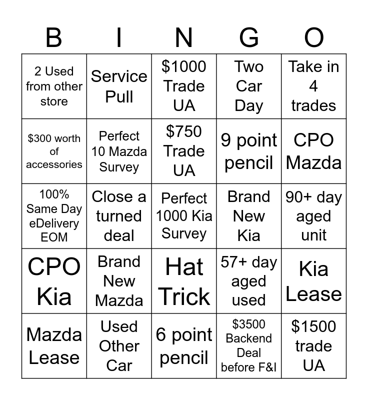 This bingo card has a free space and 24 words: Brand New Mazda, Used Other Car, $750 Trade UA, Mazda Lease, Take in 4 trades, 2 Used from other store, $300 worth of accessories, Service Pull, Brand New Kia, Hat Trick, 9 point pencil, 100% Same Day eDelivery EOM, 57+ day aged used, Kia Lease, Perfect 10 Mazda Survey, $3500 Backend Deal before F&I, 90+ day aged unit, $1000 Trade UA, CPO Mazda, Close a turned deal, $1500 trade UA, CPO Kia, Two Car Day and 6 point pencil.