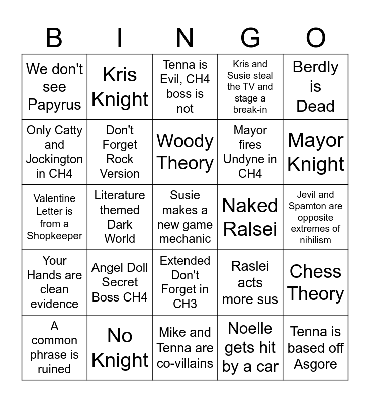 This bingo card has 25 words: Angel Doll Secret Boss CH4, Mike and Tenna are co-villains, Woody Theory, A common phrase is ruined, Berdly is Dead, We don't see Papyrus, Only Catty and Jockington in CH4, Kris Knight, Naked Ralsei, Extended Don't Forget in CH3, Mayor fires Undyne in CH4, Valentine Letter is from a Shopkeeper, Raslei acts more sus, Chess Theory, Don't Forget Rock Version, Tenna is based off Asgore, Jevil and Spamton are opposite extremes of nihilism, Tenna is Evil, CH4 boss is not, Mayor Knight, Literature themed Dark World, Susie makes a new game mechanic, No Knight, Your Hands are clean evidence, Kris and Susie steal the TV and stage a break-in and Noelle gets hit by a car.