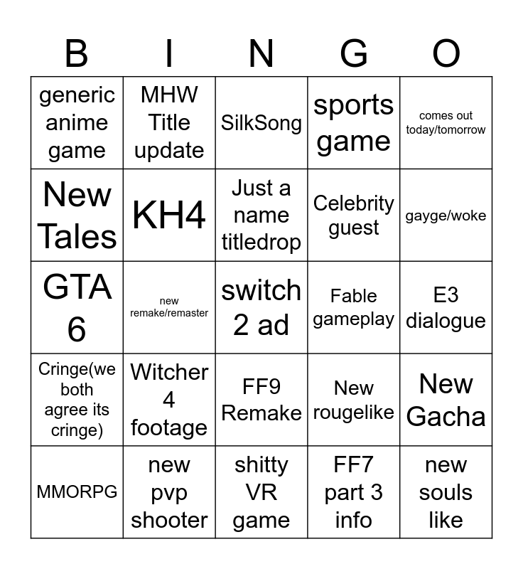 This bingo card has a free space and 24 words: Witcher 4 footage, new pvp shooter, Just a name titledrop, MMORPG, comes out today/tomorrow, generic anime game, New Tales, MHW Title update, Fable gameplay, FF9 Remake, Celebrity guest, GTA 6, New rougelike, New Gacha, KH4, FF7 part 3 info, E3 dialogue, SilkSong, gayge/woke, new remake/remaster, new souls like, Cringe(we both agree its cringe), sports game and shitty VR game.