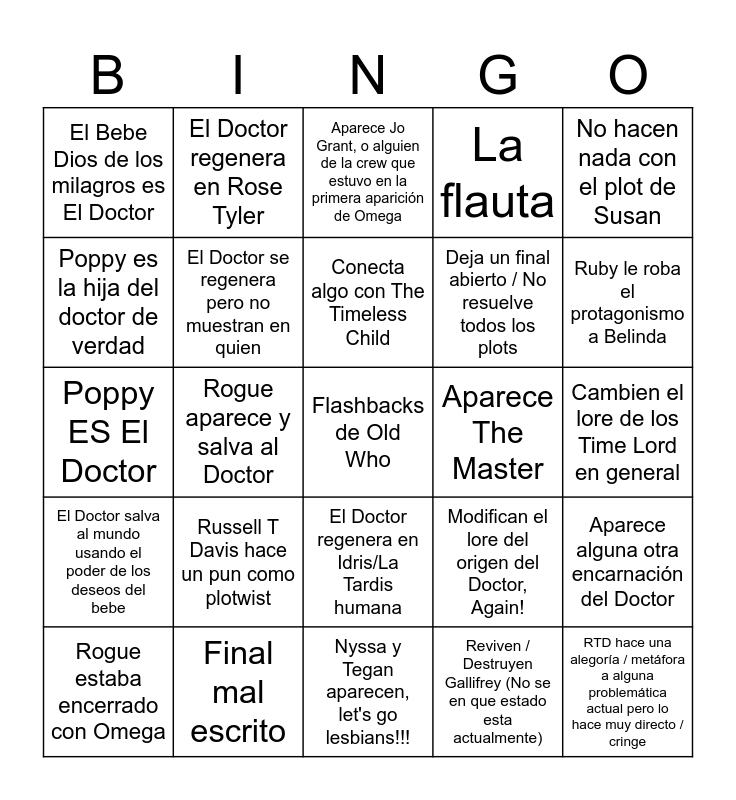 This bingo card has a free space and 24 words: Russell T Davis hace un pun como plotwist, Final mal escrito, Conecta algo con The Timeless Child, Rogue estaba encerrado con Omega, No hacen nada con el plot de Susan, El Bebe Dios de los milagros es El Doctor, Poppy es la hija del doctor de verdad, El Doctor regenera en Rose Tyler, Aparece The Master, El Doctor regenera en Idris/La Tardis humana, Deja un final abierto / No resuelve todos los plots, Poppy ES El Doctor, Modifican el lore del origen del Doctor, Again!, Aparece alguna otra encarnación del Doctor, El Doctor se regenera pero no muestran en quien, Reviven / Destruyen Gallifrey (No se en que estado esta actualmente), Cambien el lore de los Time Lord en general, Aparece Jo Grant, o alguien de la crew que estuvo en la primera aparición de Omega, Ruby le roba el protagonismo a Belinda, Rogue aparece y salva al Doctor, RTD hace una alegoría / metáfora a alguna problemática actual pero lo hace muy directo / cringe, El Doctor salva al mundo usando el poder de los deseos del bebe, La flauta and Nyssa y Tegan aparecen, let's go lesbians!!!.