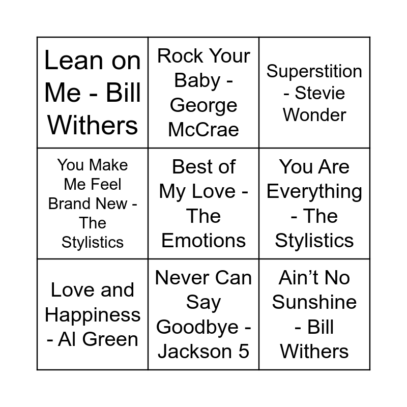 This bingo card has 20 words: Midnight Train to Georgia - Gladys Knight & the Pips, Let’s Stay Together - Al Green, Superstition - Stevie Wonder, Me and Mrs. Jones - Billy Paul, Kiss and Say Goodbye - The Manhattans, Best of My Love - The Emotions, Love Train - The O’Jays, Lean on Me - Bill Withers, Ain’t No Sunshine - Bill Withers, Rock Your Baby - George McCrae, Got to Give It Up - Marvin Gaye, If You Don’t Know Me by Now - Harold Melvin & the Blue Notes, You Are Everything - The Stylistics, I’ll Be Around - The Spinners, Love and Happiness - Al Green, Just My Imagination (Running Away with Me) - The Temptations, Never Can Say Goodbye - Jackson 5, You Make Me Feel Brand New - The Stylistics, You’re the First, the Last, My Everything - Barry White and T.S.O.P. (The Sound of Philadelphia) - MFSB.