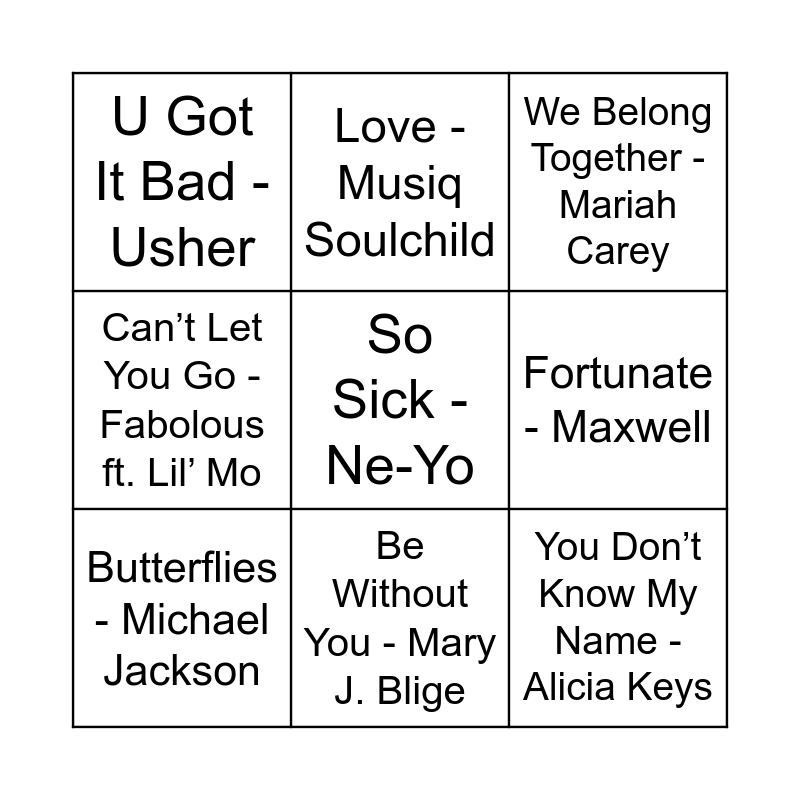This bingo card has 20 words: Charlene - Anthony Hamilton, Let Me Love You - Mario, We Belong Together - Mariah Carey, Ordinary People - John Legend, Fallin’ - Alicia Keys, So Sick - Ne-Yo, Differences - Ginuwine, U Got It Bad - Usher, You Don’t Know My Name - Alicia Keys, Love - Musiq Soulchild, Superstar - Usher, Pretty Wings - Maxwell, Fortunate - Maxwell, I Wanna Know - Joe, Butterflies - Michael Jackson, Cater 2 U - Destiny’s Child, Be Without You - Mary J. Blige, Can’t Let You Go - Fabolous ft. Lil’ Mo, Promise - Ciara and Heaven Sent - Keyshia Cole.