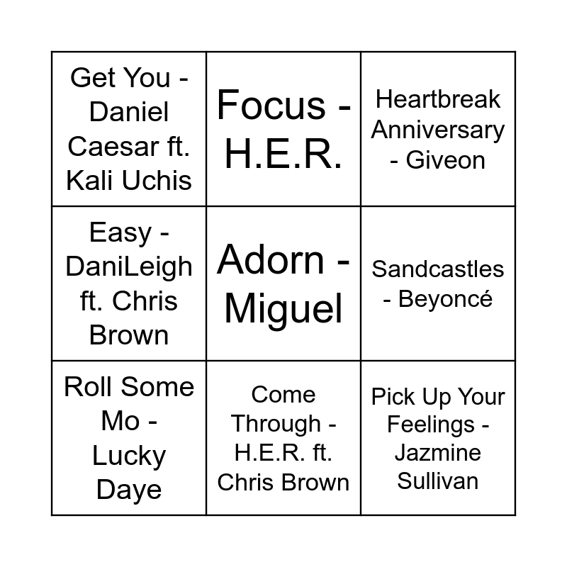 This bingo card has 20 words: Put It Down - Jazmine Sullivan, Leave the Door Open - Silk Sonic (Bruno Mars & Anderson .Paak), Heartbreak Anniversary - Giveon, Best Part - Daniel Caesar & H.E.R., Boo’d Up - Ella Mai, Adorn - Miguel, Damage - H.E.R., Get You - Daniel Caesar ft. Kali Uchis, Pick Up Your Feelings - Jazmine Sullivan, Focus - H.E.R., Love Drought - Beyoncé, All Night - Beyoncé, Sandcastles - Beyoncé, Over - Lucky Daye, Roll Some Mo - Lucky Daye, I Hate U - SZA, Come Through - H.E.R. ft. Chris Brown, Easy - DaniLeigh ft. Chris Brown, All Me - Kehlani ft. Keyshia Cole and On It - Jazmine Sullivan & Ari Lennox.