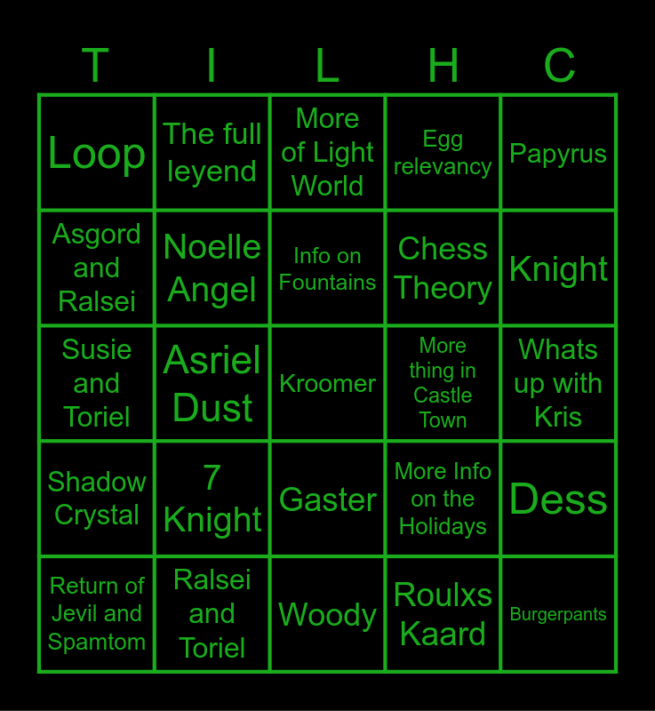 This bingo card has a free space and 24 words: 7 Knight, Ralsei and Toriel, Info on Fountains, Return of Jevil and Spamtom, Papyrus, Loop, Asgord and Ralsei, The full leyend, More thing in Castle Town, Gaster, Chess Theory, Susie and Toriel, More Info on the Holidays, Dess, Noelle Angel, Roulxs Kaard, Whats up with Kris, More of Light World, Knight, Asriel Dust, Burgerpants, Shadow Crystal, Egg relevancy and Woody.