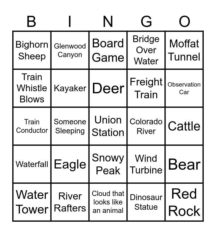 This bingo card has a free space and 24 words: Eagle, River Rafters, Deer, Water Tower, Moffat Tunnel, Bighorn Sheep, Train Whistle Blows, Glenwood Canyon, Colorado River, Snowy Peak, Freight Train, Train Conductor, Wind Turbine, Bear, Kayaker, Dinosaur Statue, Cattle, Board Game, Observation Car, Someone Sleeping, Red Rock, Waterfall, Bridge Over Water and Cloud that looks like an animal.