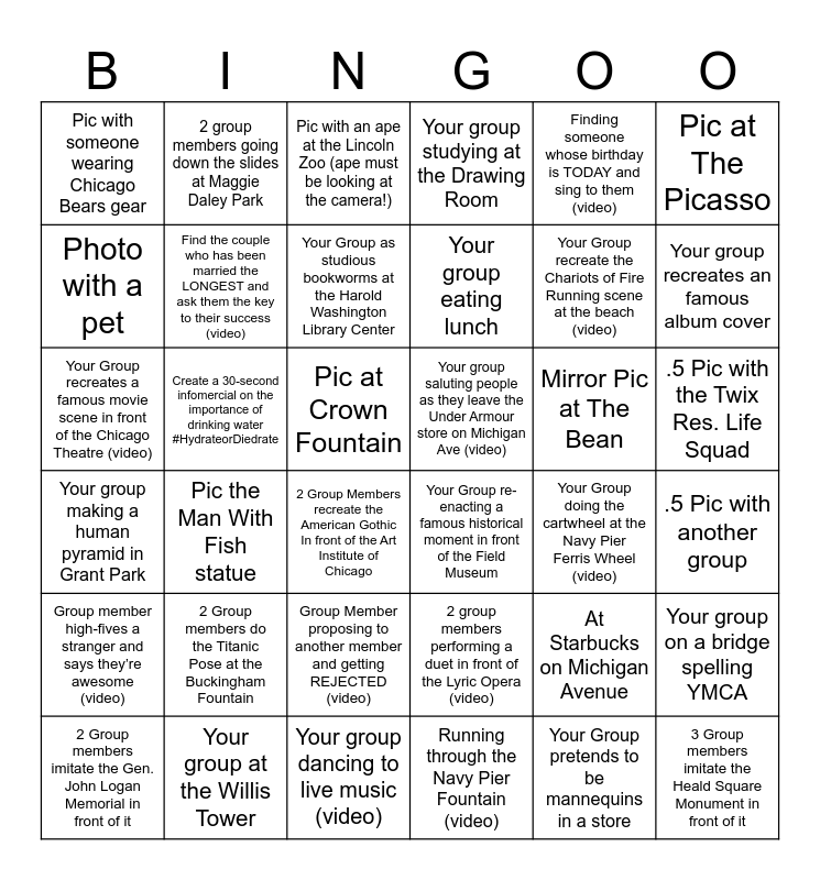 This bingo card has 36 words: 2 group members performing a duet in front of the Lyric Opera (video), Group Member proposing to another member and getting REJECTED (video), Running through the Navy Pier Fountain (video), Photo with a pet, Your group making a human pyramid in Grant Park, Your group saluting people as they leave the Under Armour store on Michigan Ave (video), Find the couple who has been married the LONGEST and ask them the key to their success (video), Your group dancing to live music (video), Finding someone whose birthday is TODAY and sing to them (video), At Starbucks on Michigan Avenue, Your group recreates an famous album cover, Your group studying at the Drawing Room, Your group on a bridge spelling YMCA, Create a 30-second infomercial on the importance of drinking water #HydrateorDiedrate, Your group eating lunch, Pic with someone wearing Chicago Bears gear, Group member high-fives a stranger and says they’re awesome (video), Mirror Pic at The Bean, Your Group recreates a famous movie scene in front of the Chicago Theatre (video), Pic with an ape at the Lincoln Zoo (ape must be looking at the camera!), Pic at Crown Fountain, Pic the Man With Fish statue, Your Group re-enacting a famous historical moment in front of the Field Museum, 2 Group Members recreate the American Gothic In front of the Art Institute of Chicago, Your Group doing the cartwheel at the Navy Pier Ferris Wheel (video), 2 group members going down the slides at Maggie Daley Park, Your Group recreate the Chariots of Fire Running scene at the beach (video), Your group at the Willis Tower, Your Group as studious bookworms at the Harold Washington Library Center, Pic at The Picasso, 3 Group members imitate the Heald Square Monument in front of it, 2 Group members imitate the Gen. John Logan Memorial in front of it, .5 Pic with another group, .5 Pic with the Twix Res. Life Squad, 2 Group members do the Titanic Pose at the Buckingham Fountain and Your Group pretends to be mannequins in a store.