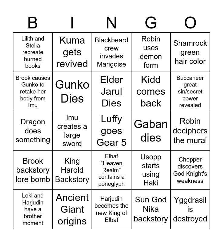 This bingo card has a free space and 24 words: King Harold Backstory, Ancient Giant origins, Elder Jarul Dies, Loki and Harjudin have a brother moment, Shamrock green hair color, Lilith and Stella recreate burned books, Brook causes Gunko to retake her body from Imu, Kuma gets revived, Gaban dies, Elbaf "Heaven Realm" contains a poneglyph, Kidd comes back, Dragon does something, Usopp starts using Haki, Chopper discovers God Knight's weakness, Gunko Dies, Sun God Nika backstory, Robin deciphers the mural, Blackbeard crew invades Marigoise, Buccaneer great sin/secret power revealed, Imu creates a large sword, Yggdrasil is destroyed, Brook backstory lore bomb, Robin uses demon form and Harjudin becomes the new King of Elbaf.