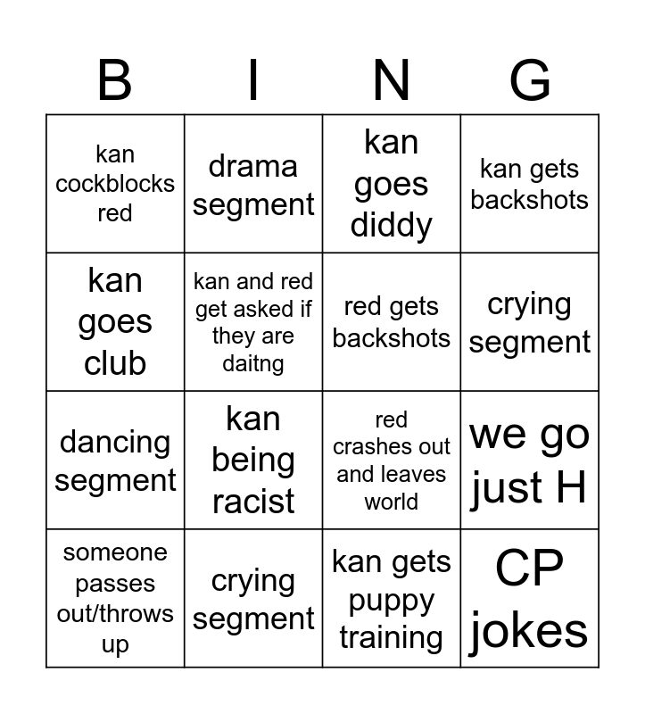 This bingo card has 18 words: kan being racist, CP jokes, kan goes diddy, kan cockblocks red, red crashes out and leaves world, kan gets backshots, someone passes out/throws up, drama segment, crying segment, dancing segment, kan gets puppy training, kan goes club, we go just H, kan and red get asked if they are daitng, red gets backshots, red goes diddy, crying segment and mazzie in deer avatar.