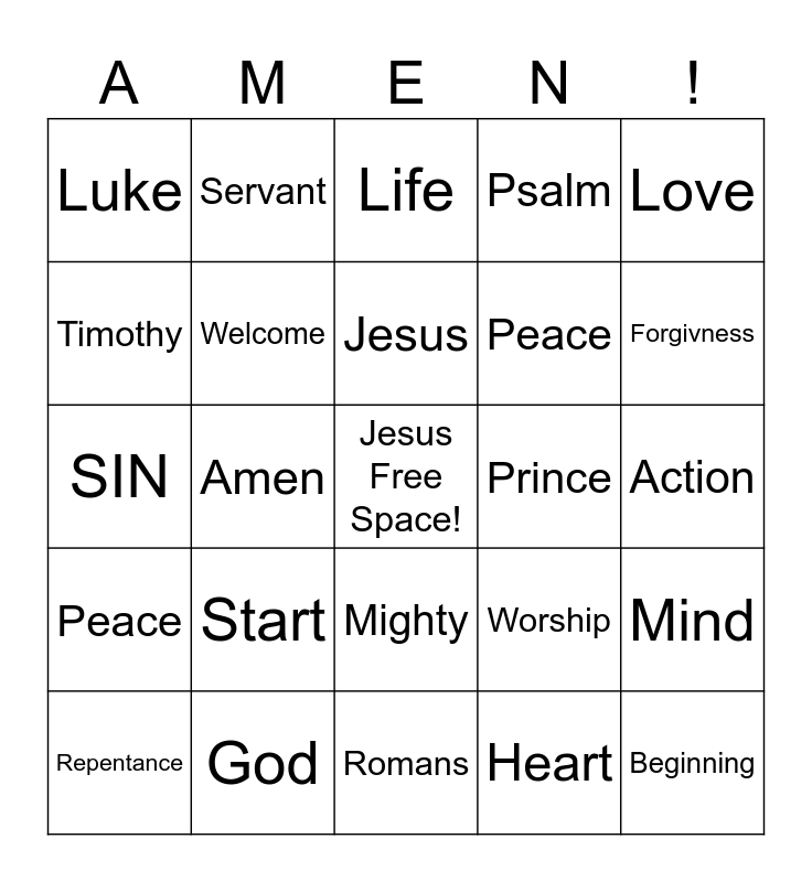 This bingo card has a free space and 24 words: Start, God, Jesus, Repentance, Love, Luke, Timothy, Servant, Prince, Mighty, Peace, SIN, Worship, Mind, Welcome, Heart, Action, Life, Forgivness, Amen, Beginning, Peace, Psalm and Romans.