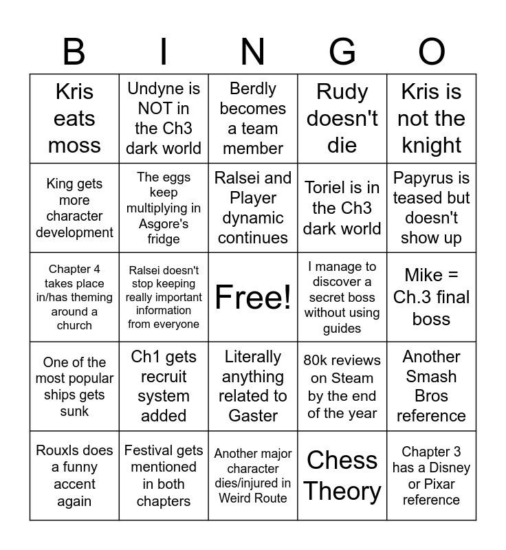 This bingo card has a free space and 24 words: Ch1 gets recruit system added, Festival gets mentioned in both chapters, Ralsei and Player dynamic continues, Rouxls does a funny accent again, Kris is not the knight, Kris eats moss, King gets more character development, Undyne is NOT in the Ch3 dark world, I manage to discover a secret boss without using guides, Literally anything related to Gaster, Toriel is in the Ch3 dark world, Chapter 4 takes place in/has theming around a church, 80k reviews on Steam by the end of the year, Another Smash Bros reference, The eggs keep multiplying in Asgore's fridge, Chess Theory, Mike = Ch.3 final boss, Berdly becomes a team member, Papyrus is teased but doesn't show up, Ralsei doesn't stop keeping really important information from everyone, Chapter 3 has a Disney or Pixar reference, One of the most popular ships gets sunk, Rudy doesn't die and Another major character dies/injured in Weird Route.