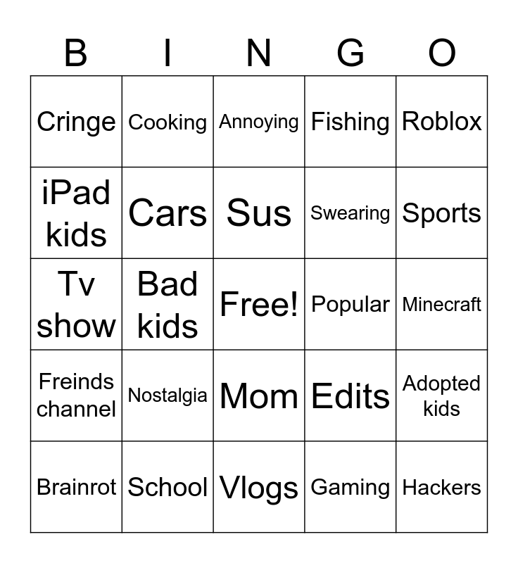 This bingo card has a free space and 24 words: Brainrot, Nostalgia, Sus, Gaming, Roblox, Cringe, Cooking, Annoying, Popular, Minecraft, Tv show, Cars, Edits, Adopted kids, iPad kids, School, Vlogs, Fishing, Sports, Freinds channel, Bad kids, Mom, Swearing and Hackers.