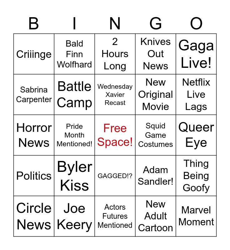 This bingo card has a free space and 24 words: Byler Kiss, Joe Keery, Wednesday Xavier Recast, Circle News, Gaga Live!, Criiinge, Sabrina Carpenter, Bald Finn Wolfhard, Squid Game Costumes, GAGGED!?, New Original Movie, Horror News, Adam Sandler!, Thing Being Goofy, Battle Camp, New Adult Cartoon, Queer Eye, 2 Hours Long, Netflix Live Lags, Pride Month Mentioned!, Marvel Moment, Politics, Knives Out News and Actors Futures Mentioned.