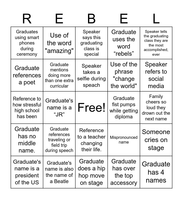 This bingo card has a free space and 24 words: Graduate's name is a president of the US, Graduate references traveling or field trip during speech, Speaker takes a selfie during speach, Graduate has over the top accessory, Speaker tells the graduating class they are the most accomplished, ever, Graduates using smart phones during ceremony, Use of the word "amazing", Speaker says this graduating class is special, Graduate fist pumps while getting diploma, Family cheers so loud they drown out the next name, Reference to how stressful high school has been, Graduate mentions doing more than one extra curricular, Mispronounced name, Someone cries on stage, Graduate references a poet, Graduate's name is also the name of a Beatle, Graduate does a hip hop move on stage, Graduate uses the word “rebels”, Speaker refers to social media, Graduate has no middle name., Graduate's name is a “JR”, Reference to a teacher changing their life., Use of the phrase "change the world" and Graduate has 4 names.