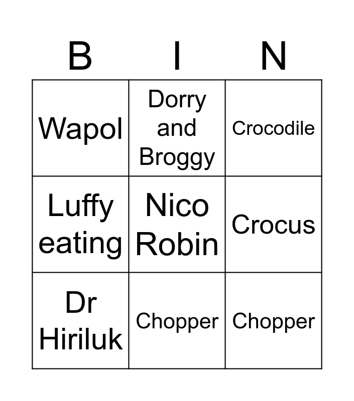 This bingo card has 15 words: Dorry and Broggy, Mr. 3, Crocodile, Wapol, Chopper, Nico Robin, Ace, Smoker, Crocus, Chopper, Nico Robin, Luffy eating, Dr Hiriluk, Dorry and Broggy and Smoker.