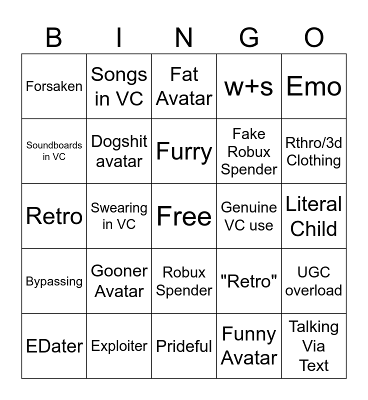 This bingo card has a free space and 24 words: Gooner Avatar, Exploiter, Furry, EDater, Emo, Forsaken, Soundboards in VC, Songs in VC, Genuine VC use, Robux Spender, Fake Robux Spender, Retro, "Retro", UGC overload, Dogshit avatar, Funny Avatar, Literal Child, Fat Avatar, Rthro/3d Clothing, Swearing in VC, Talking Via Text, Bypassing, w+s and Prideful.