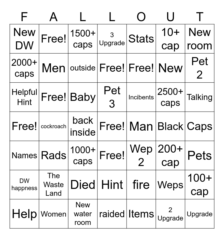 This bingo card has a free space and 48 words: fire, New, raided, cockroach, Baby, Caps, Free!, Women, 10+ cap, Free!, New room, 3 Upgrade, 2500+ caps, Incibents, DW happness, Black, 2000+ caps, Pet 2, Weps, Stats, Free!, back inside, New DW, Men, 100+ cap, outside, Talking, Help, Pet 3, Free!, 2 Upgrade, Man, Pets, The Waste Land, Free!, Wep 2, 200+ cap, Helpful Hint, 1000+ caps, Died, Names, Upgrade, 1500+ caps, New water room, Free!, Hint, Rads and Items.