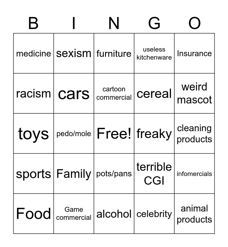 This bingo card has a free space and 24 words: Family, Game commercial, cartoon commercial, Food, Insurance, medicine, racism, sexism, freaky, pots/pans, cereal, toys, terrible CGI, infomercials, cars, celebrity, cleaning products, furniture, weird mascot, pedo/mole, animal products, sports, useless kitchenware and alcohol.