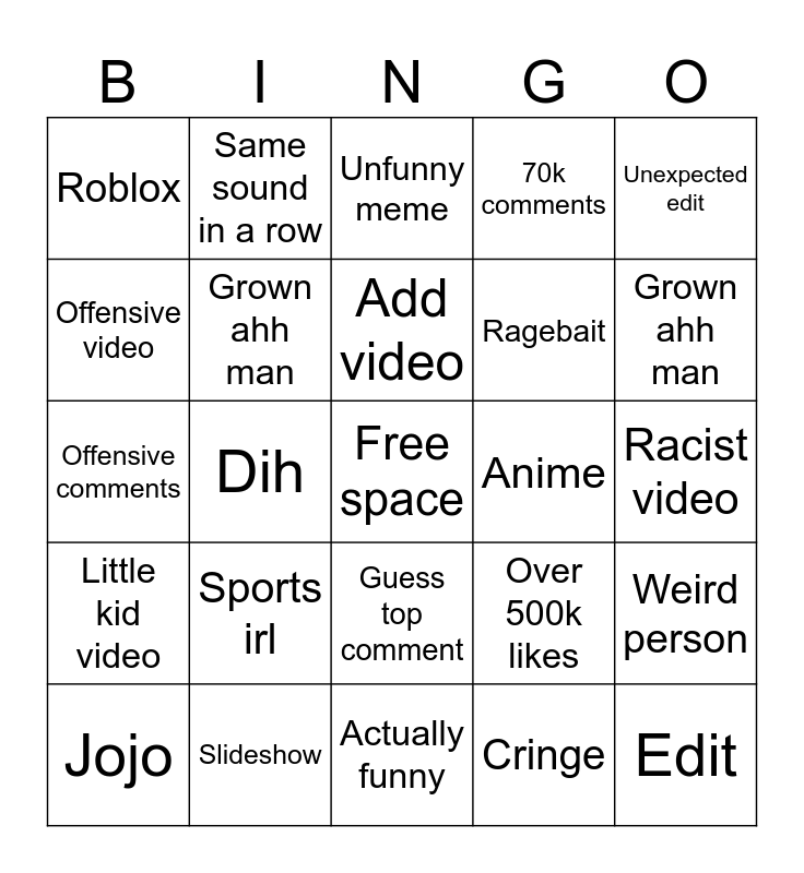 This bingo card has a free space and 24 words: Sports irl, Slideshow, Add video, Jojo, Unexpected edit, Roblox, Offensive video, Same sound in a row, Anime, Guess top comment, Ragebait, Offensive comments, Over 500k likes, Weird person, Grown ahh man, Cringe, Racist video, Unfunny meme, Grown ahh man, Dih, Edit, Little kid video, 70k comments and Actually funny.