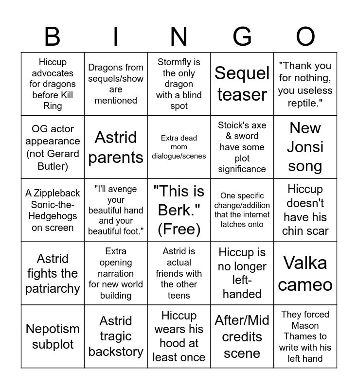 This bingo card has a free space and 24 words: Extra opening narration for new world building, Astrid tragic backstory, Extra dead mom dialogue/scenes, Nepotism subplot, "Thank you for nothing, you useless reptile.", Hiccup advocates for dragons before Kill Ring, OG actor appearance (not Gerard Butler), Dragons from sequels/show are mentioned, One specific change/addition that the internet latches onto, Astrid is actual friends with the other teens, Stoick's axe & sword have some plot significance, A Zippleback Sonic-the-Hedgehogs on screen, Hiccup is no longer left-handed, Valka cameo, Astrid parents, After/Mid credits scene, Hiccup doesn't have his chin scar, Stormfly is the only dragon with a blind spot, New Jonsi song, "I'll avenge your beautiful hand and your beautiful foot.", They forced Mason Thames to write with his left hand, Astrid fights the patriarchy, Sequel teaser and Hiccup wears his hood at least once.