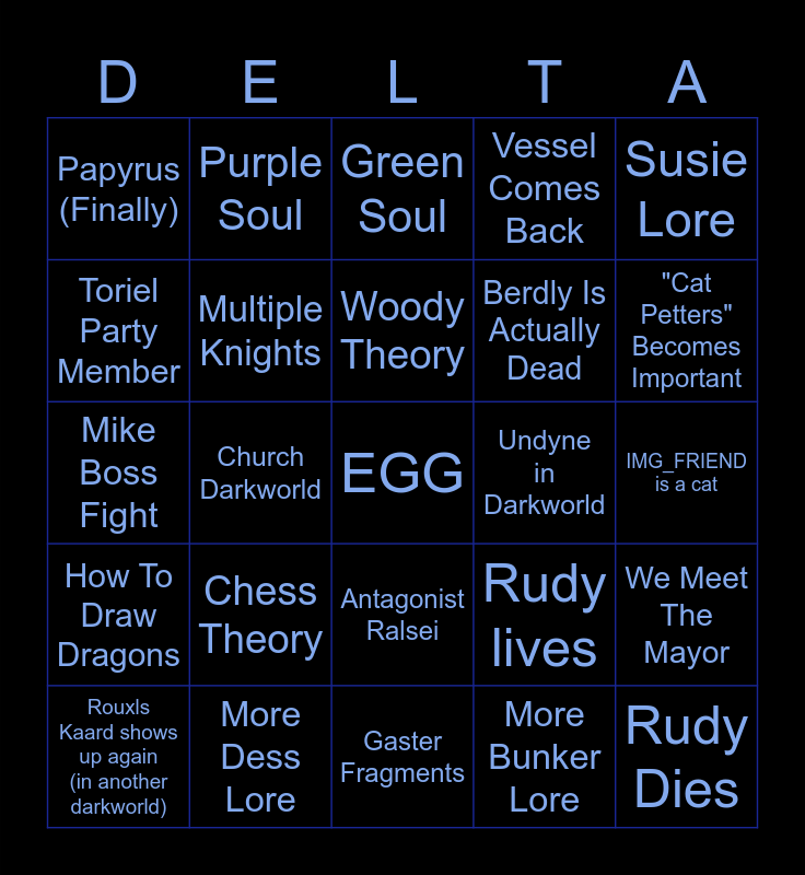 This bingo card has a free space and 24 words: Chess Theory, More Dess Lore, Woody Theory, Rouxls Kaard shows up again (in another darkworld), Susie Lore, Papyrus (Finally), Toriel Party Member, Purple Soul, Undyne in Darkworld, Antagonist Ralsei, Berdly Is Actually Dead, Mike Boss Fight, Rudy lives, We Meet The Mayor, Multiple Knights, More Bunker Lore, IMG_FRIEND is a cat, Green Soul, "Cat Petters" Becomes Important, Church Darkworld, Rudy Dies, How To Draw Dragons, Vessel Comes Back and Gaster Fragments.