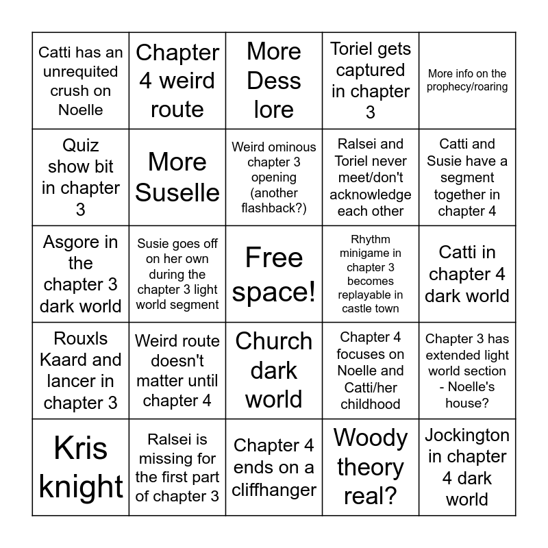 This bingo card has a free space and 24 words: Weird route doesn't matter until chapter 4, Ralsei is missing for the first part of chapter 3, Weird ominous chapter 3 opening (another flashback?), Kris knight, More info on the prophecy/roaring, Catti has an unrequited crush on Noelle, Quiz show bit in chapter 3, Chapter 4 weird route, Rhythm minigame in chapter 3 becomes replayable in castle town, Church dark world, Ralsei and Toriel never meet/don't acknowledge each other, Asgore in the chapter 3 dark world, Chapter 4 focuses on Noelle and Catti/her childhood, Chapter 3 has extended light world section - Noelle's house?, More Suselle, Woody theory real?, Catti in chapter 4 dark world, More Dess lore, Catti and Susie have a segment together in chapter 4, Susie goes off on her own during the chapter 3 light world segment, Jockington in chapter 4 dark world, Rouxls Kaard and lancer in chapter 3, Toriel gets captured in chapter 3 and Chapter 4 ends on a cliffhanger.