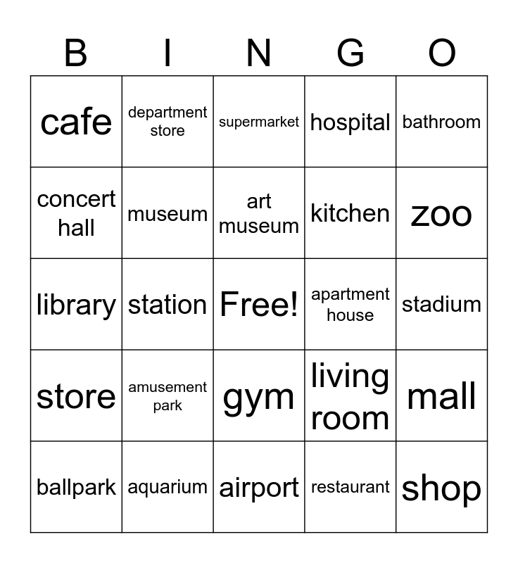 This bingo card has a free space and 24 words: amusement park, aquarium, art museum, ballpark, bathroom, cafe, concert hall, department store, apartment house, gym, kitchen, library, living room, mall, museum, restaurant, stadium, supermarket, zoo, station, shop, store, hospital and airport.